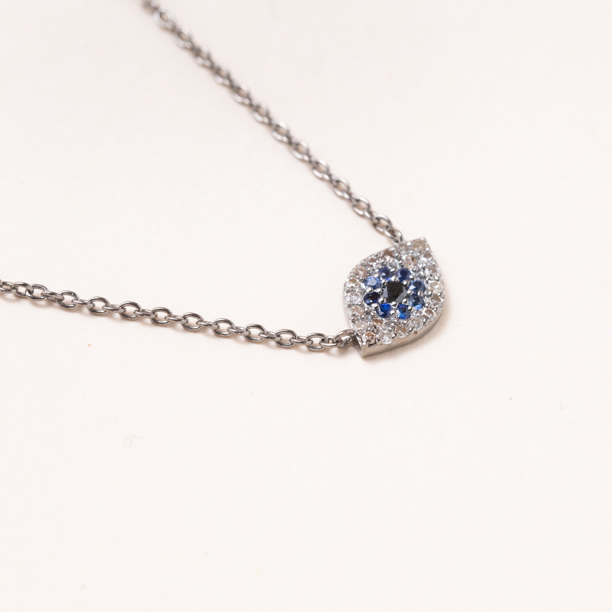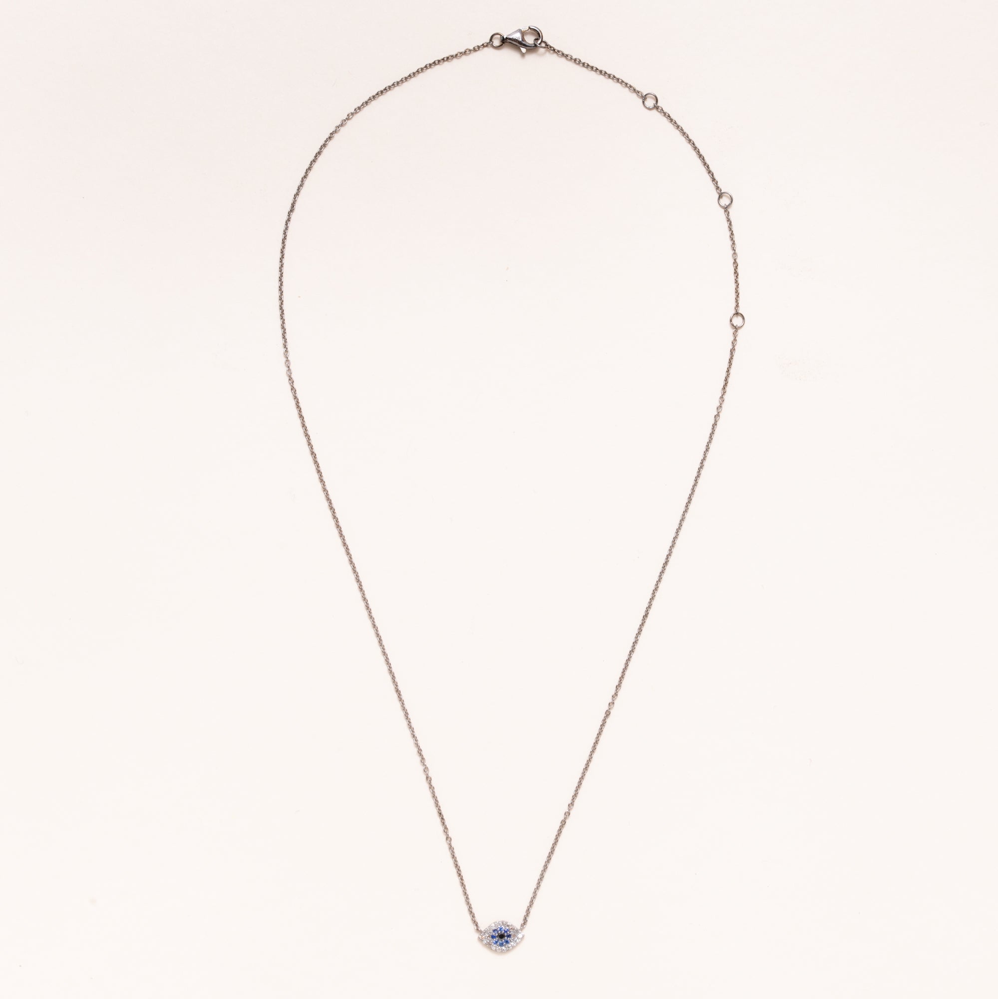 This Diamond and Sapphire Evil Eye necklace has multiple loops for the clasp making it adjustable from 12" all the way to 18" in length. Evil Eyes are a symbol of protection, said to ward off evil by staring back at the world.