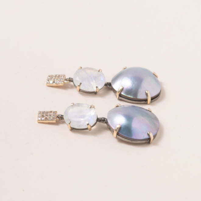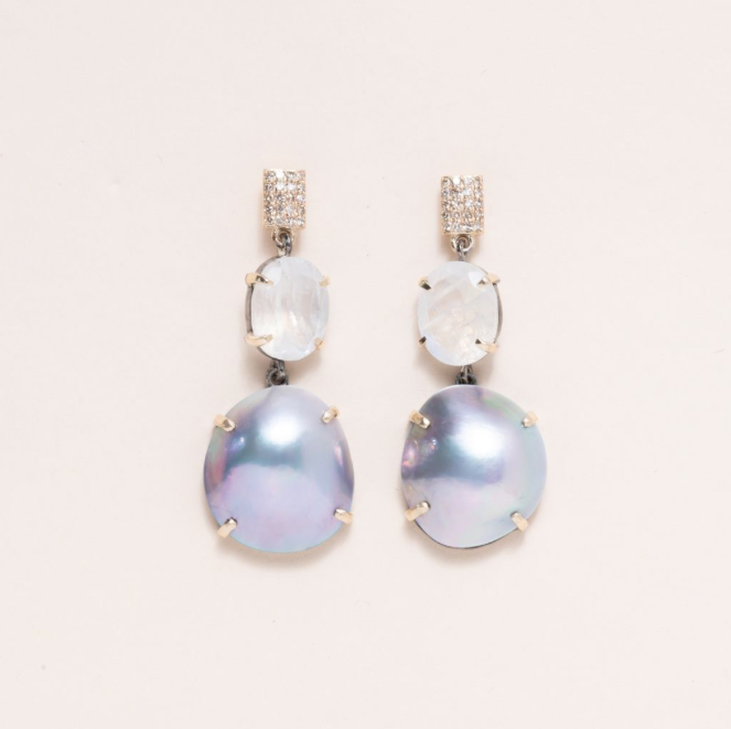 Mabe Pearl, Moonstone, 14K Gold & Pave Diamond Drop Earrings