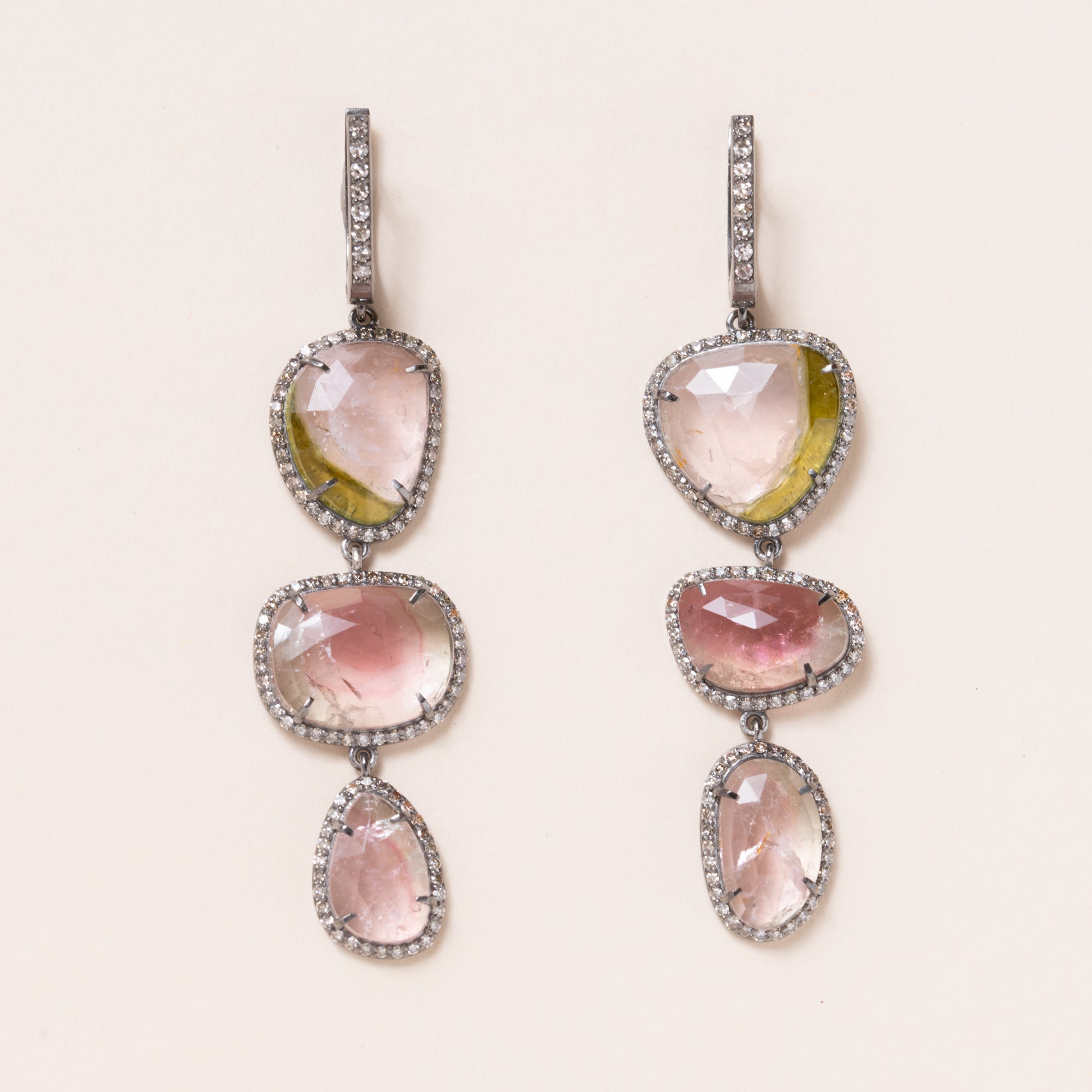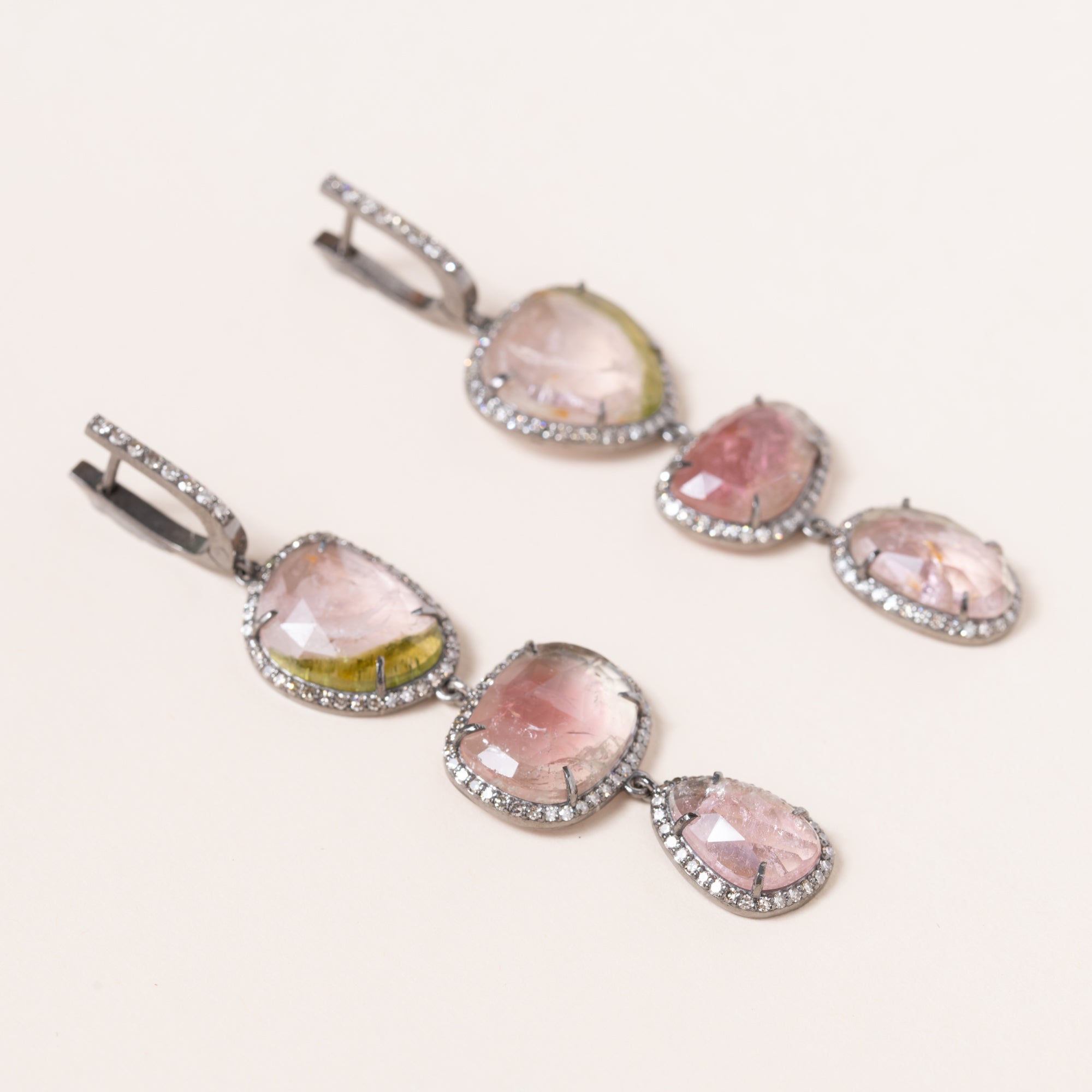 Natural Tourmaline set in Silver with Pave Diamonds Earrings