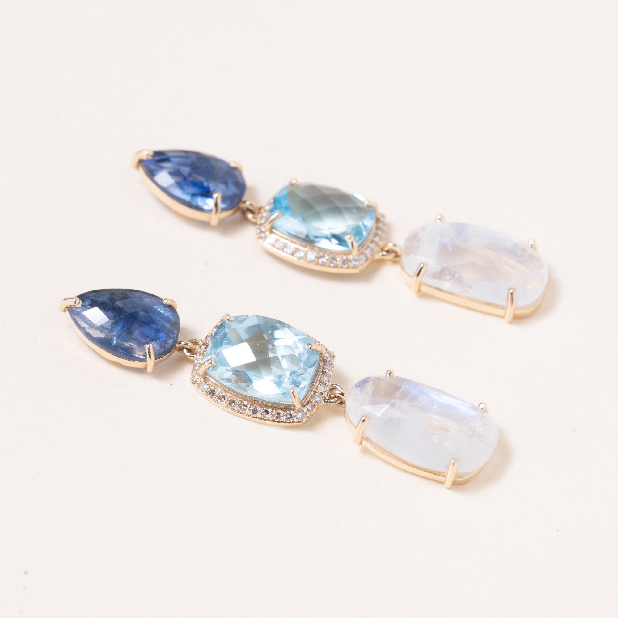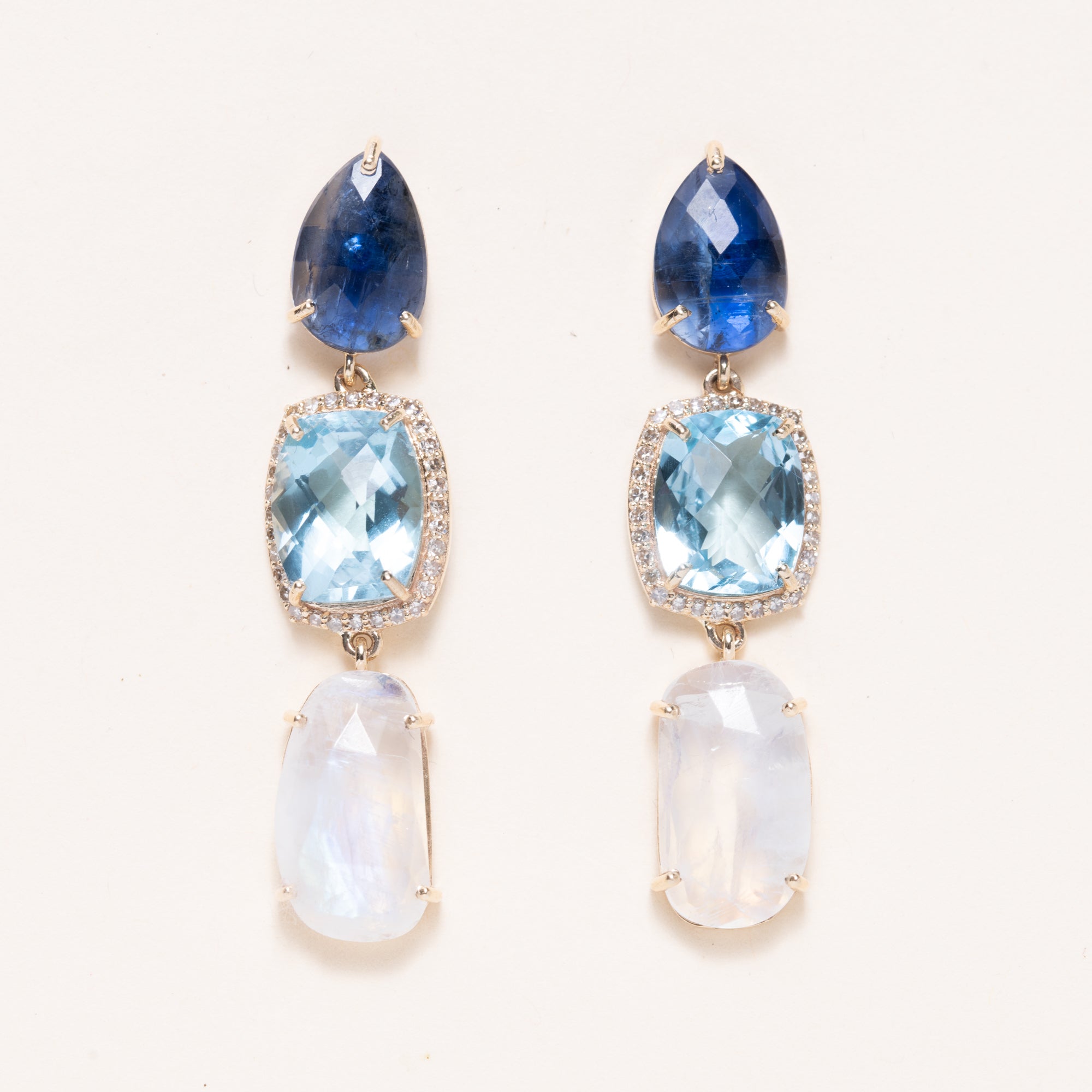 Neon Kyanite, Aquamarine, Moonstone, 14K Gold & Pavé Diamond Earrings