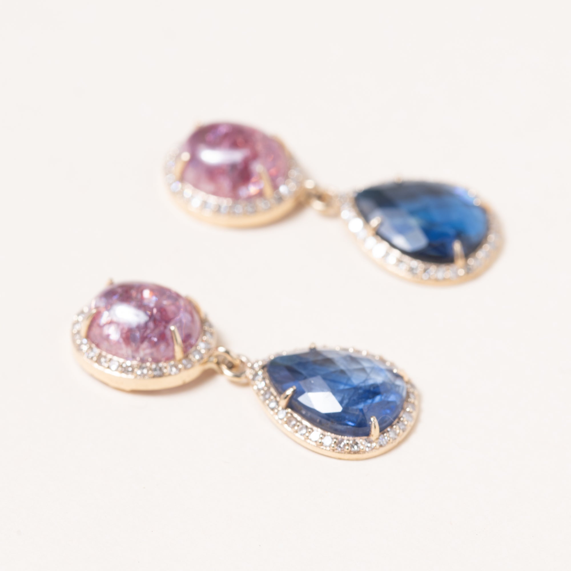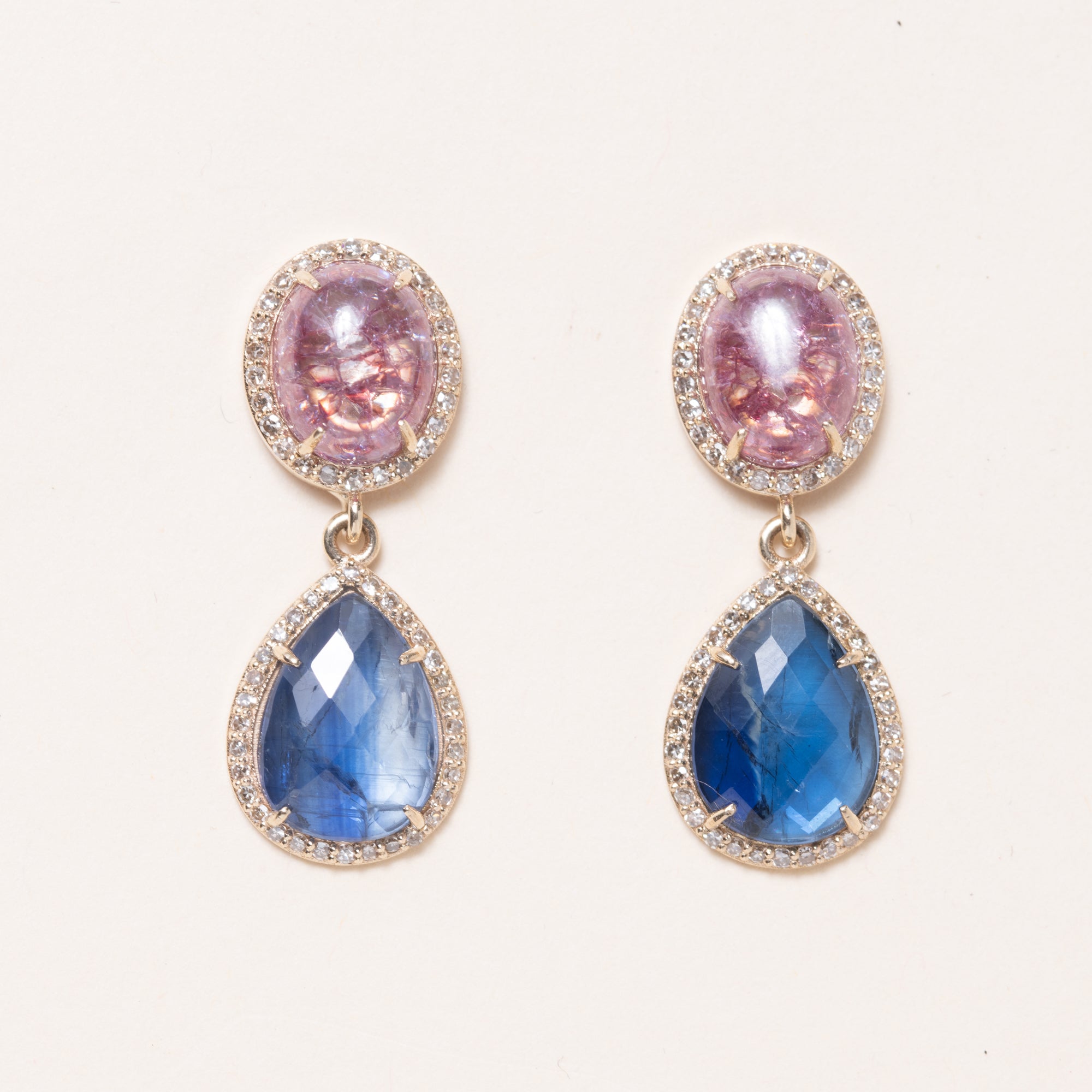 Sunstone, Neon Kyanite Drops, 14k Gold & Pave Diamonds Earrings