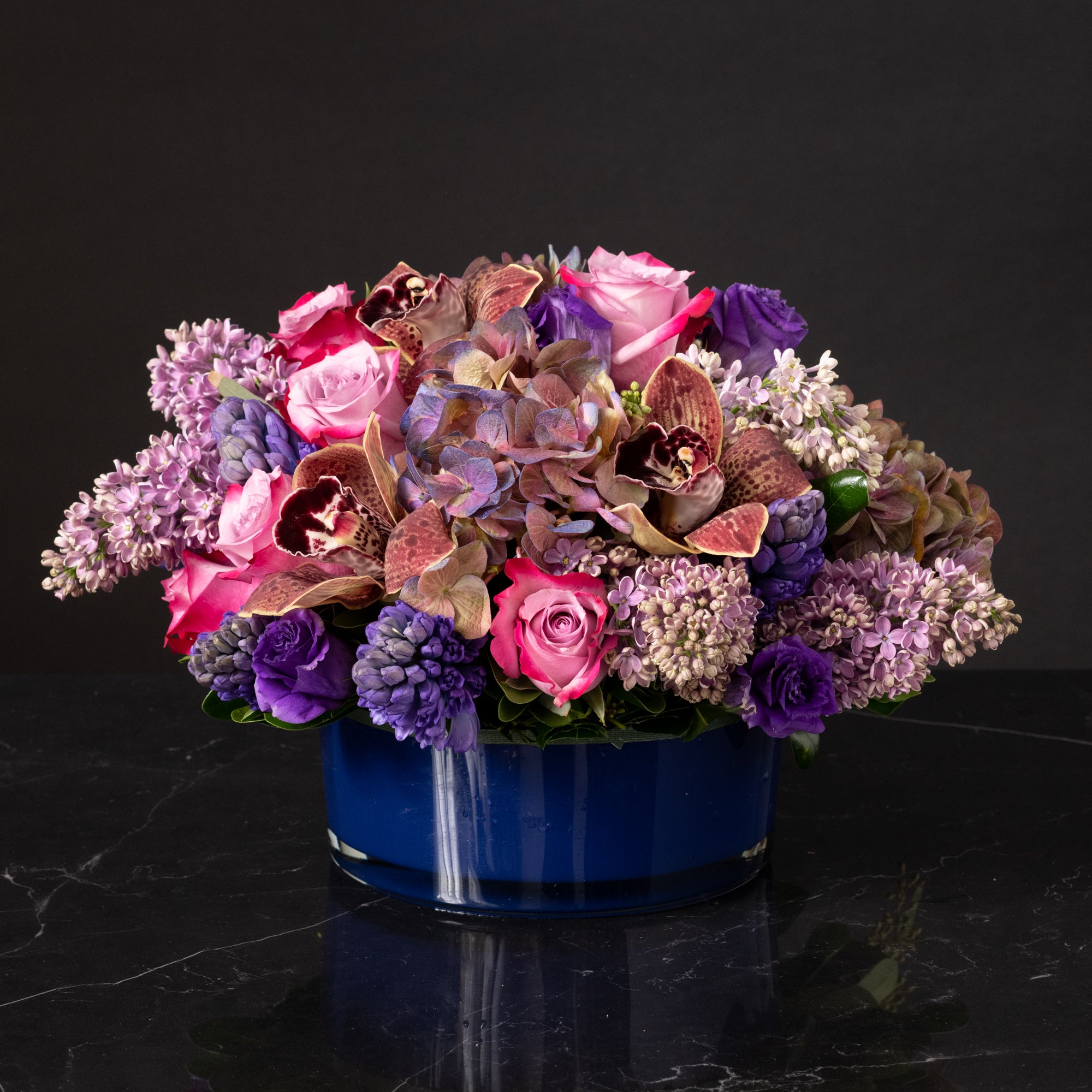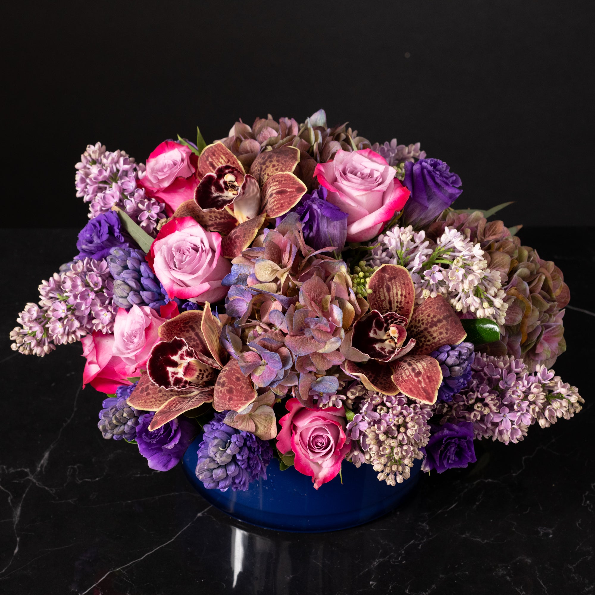 Deep and sophisticated, the Bloom Royal Centerpiece is a classic petal to petal, European style design, featuring a combination of textures in monochromatic tones and jewel hues. *Featuring florals such as, orchids, roses, and lisianthus.