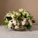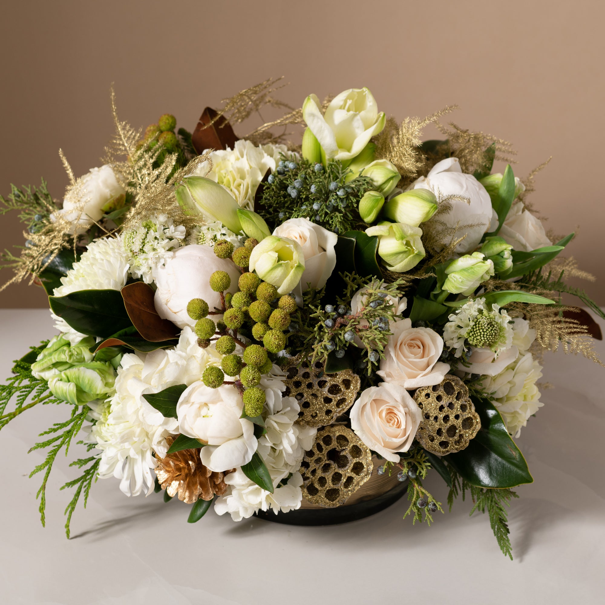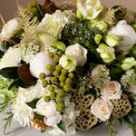 Festive and elegant, Noel is a classic petal to petal, European style design, featuring a combination of textures in white tones and natural hues.