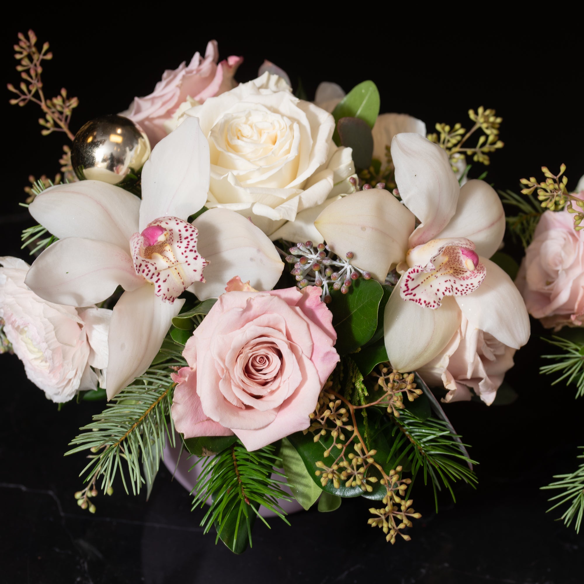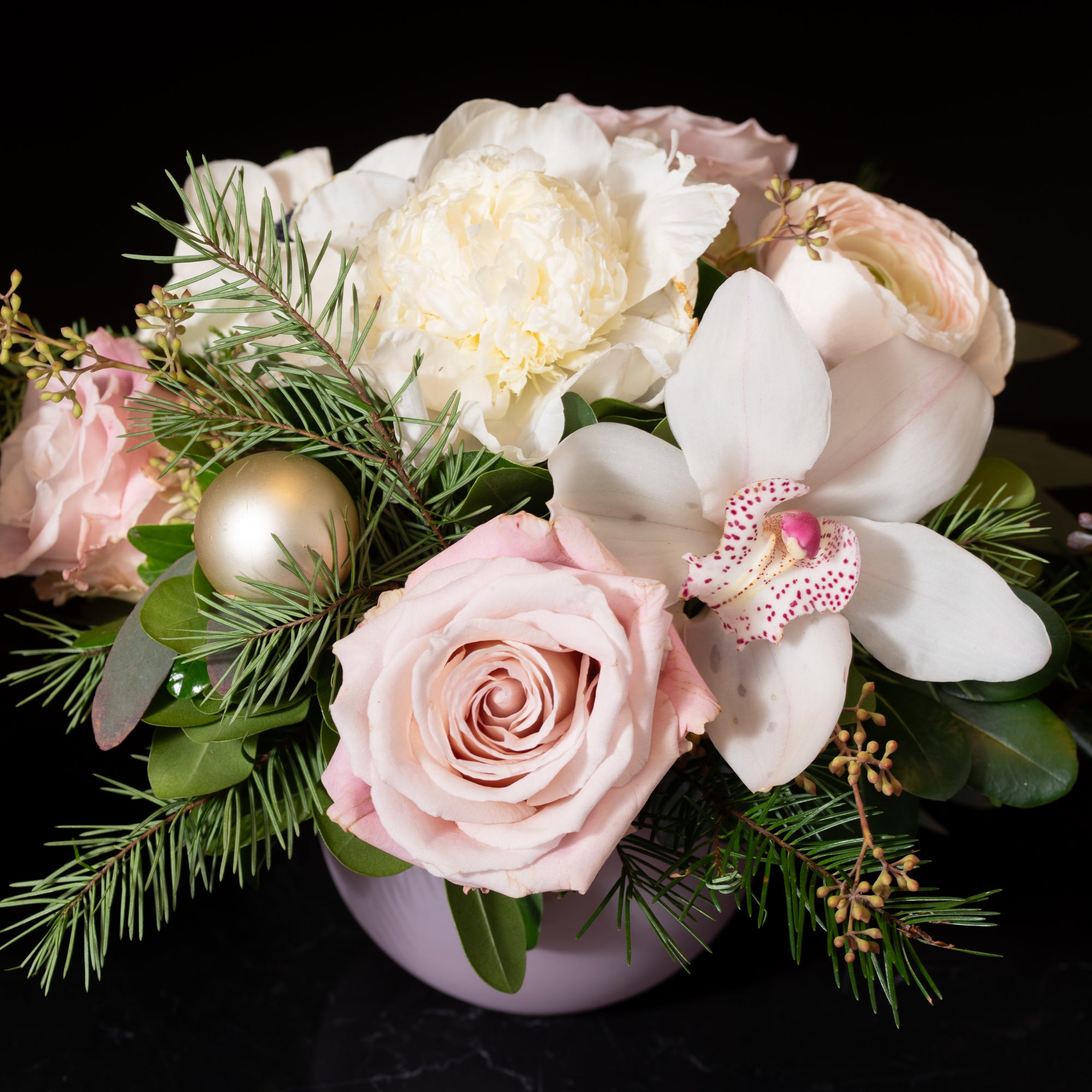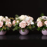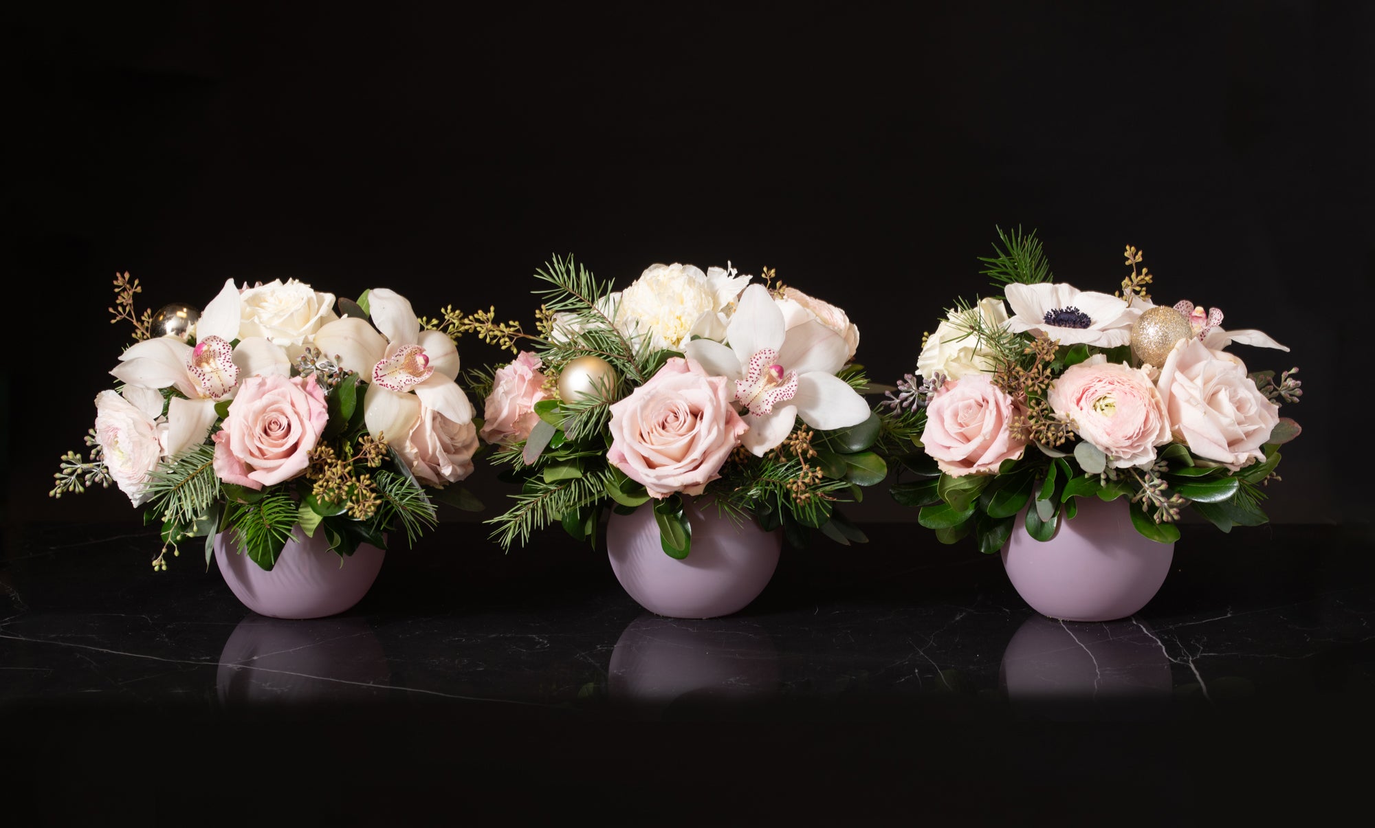This sweet trio is a modern take on traditional holiday arrangements. Christmas greenery and holiday decor fuse the traditional aspects of a holiday arrangement with the modern color pallet. Get this special holiday trio to dress up a table setting, or spread them around your home for some holiday cheer everywhere you turn!