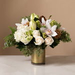 A sophisticated arrangement featuring white roses, hydrangeas, cymbidium orchids, and green amaryllis buds, complemented by evergreen foliage, gold pinecones, and a touch of seasonal berries in a gold vase.