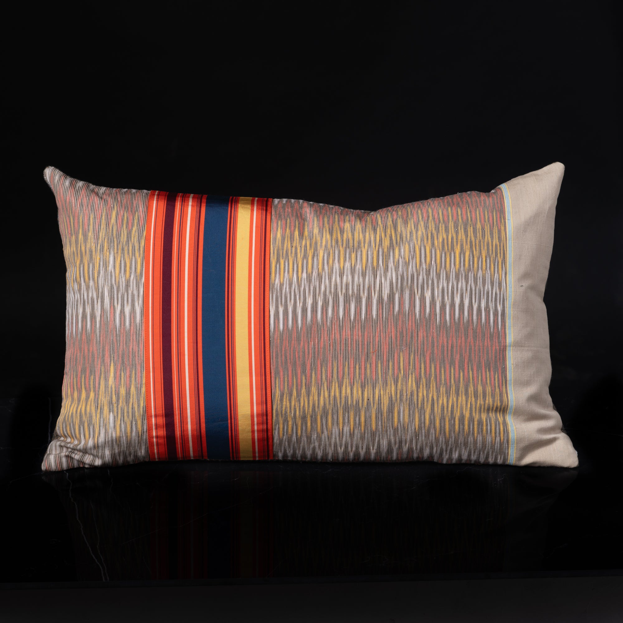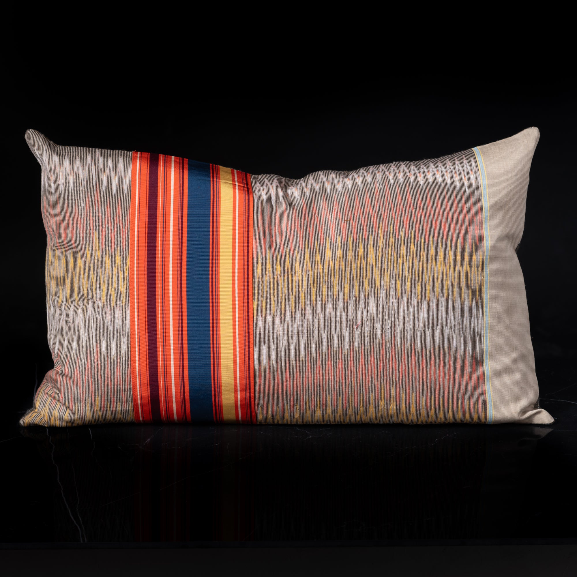 The textiles used to make this pillow are sourced from Anuschka's last trips to Indonesia and Japan. Sourced from the Islands of Java and Sumatra, and Japan, Anuschka then sent the fabrics to Germany, where her mother (a master quilter) handcrafted this beautiful decorative pillow. This is a one of a kind handmade creation!