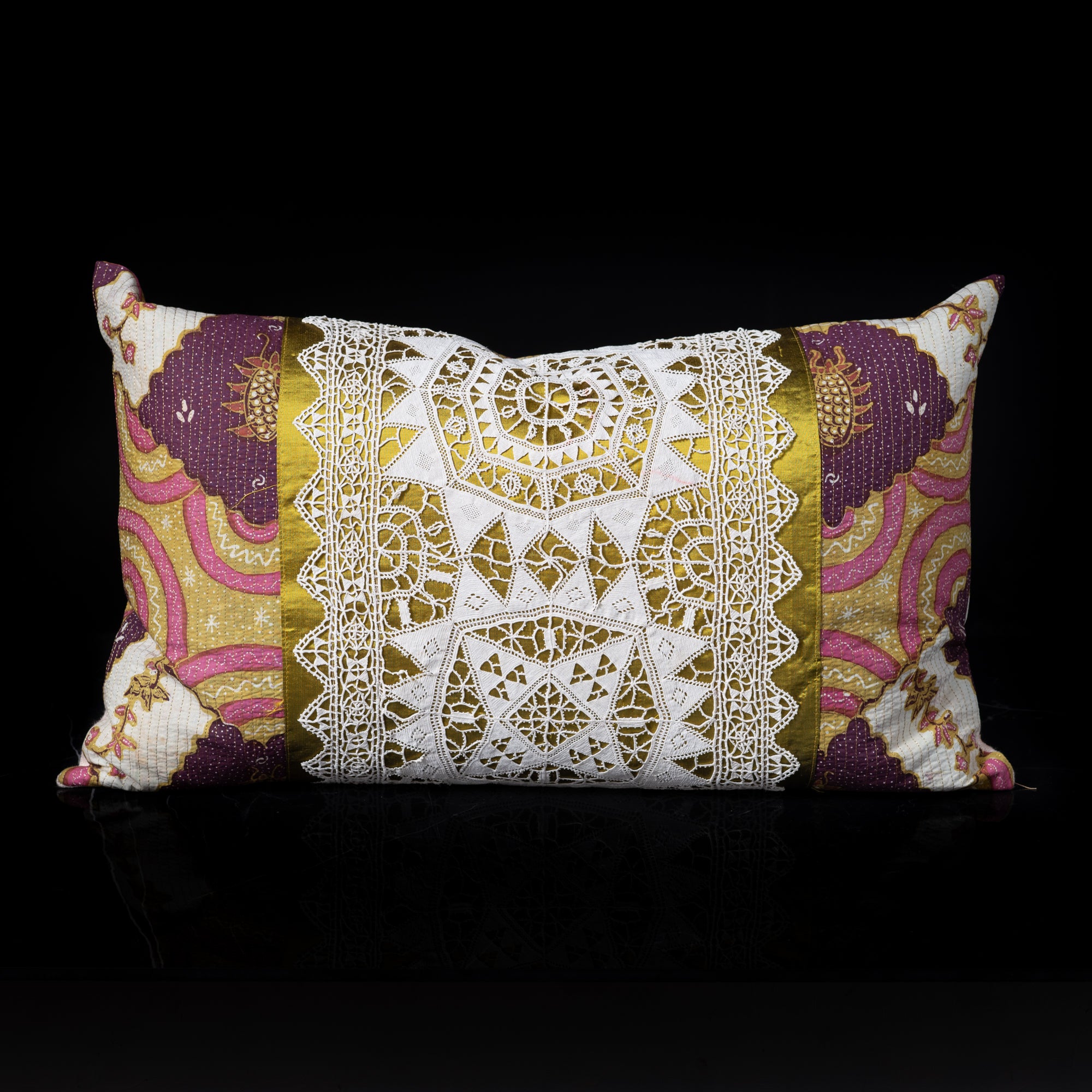 The textiles used to make this pillow are sourced from Anuschka's last trip to Indonesia. The fabric she sourced from the Islands of Java and Sumatra, along with vintage lace, and silk, Anuschka then sent the fabrics to Germany, where her mother (a master quilter) handcrafted this beautiful decorative pillow. This is a one of a kind handmade creation!