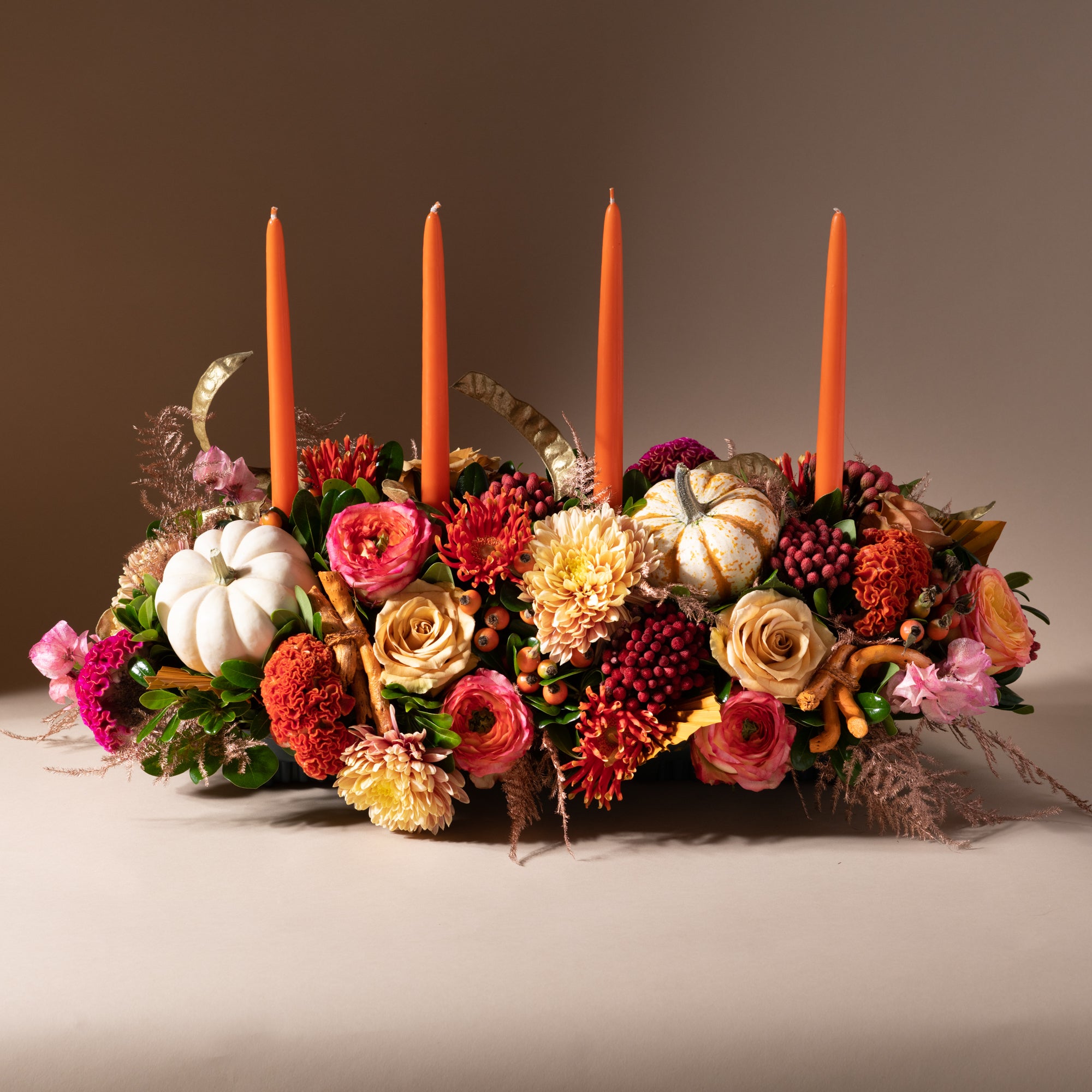 Warm and welcoming, our Thanksgiving Centerpiece is a classic petal to petal, European style design, featuring a combination of textures in warm tones and soft hues. featuring seasonally available pumpkins, garden roses, rosehip berries, chrysanthemums, celosia and fall textures, it is sure to bring beauty to your table.