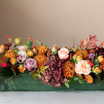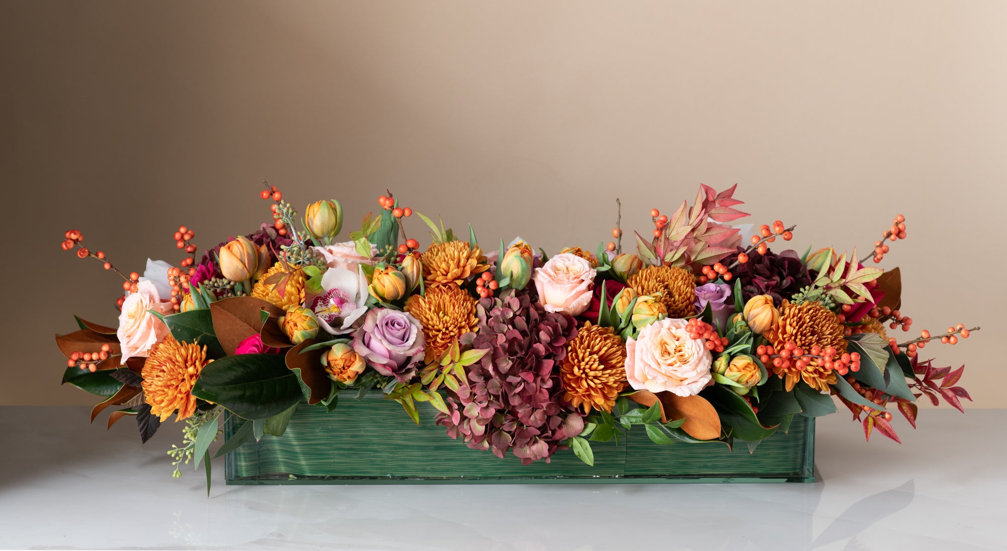 Giving is the perfect choice to brighten up your holiday tablescape. Arranged in the petal to petal, European style design signature to Bloom, Giving features a combination of textures in mixed tones and vivid hues. The deep and rustic colors of the Mums, Berries, and Foliage provide the perfect compliment to the brightness of the warm Roses, Berries and Tulips.