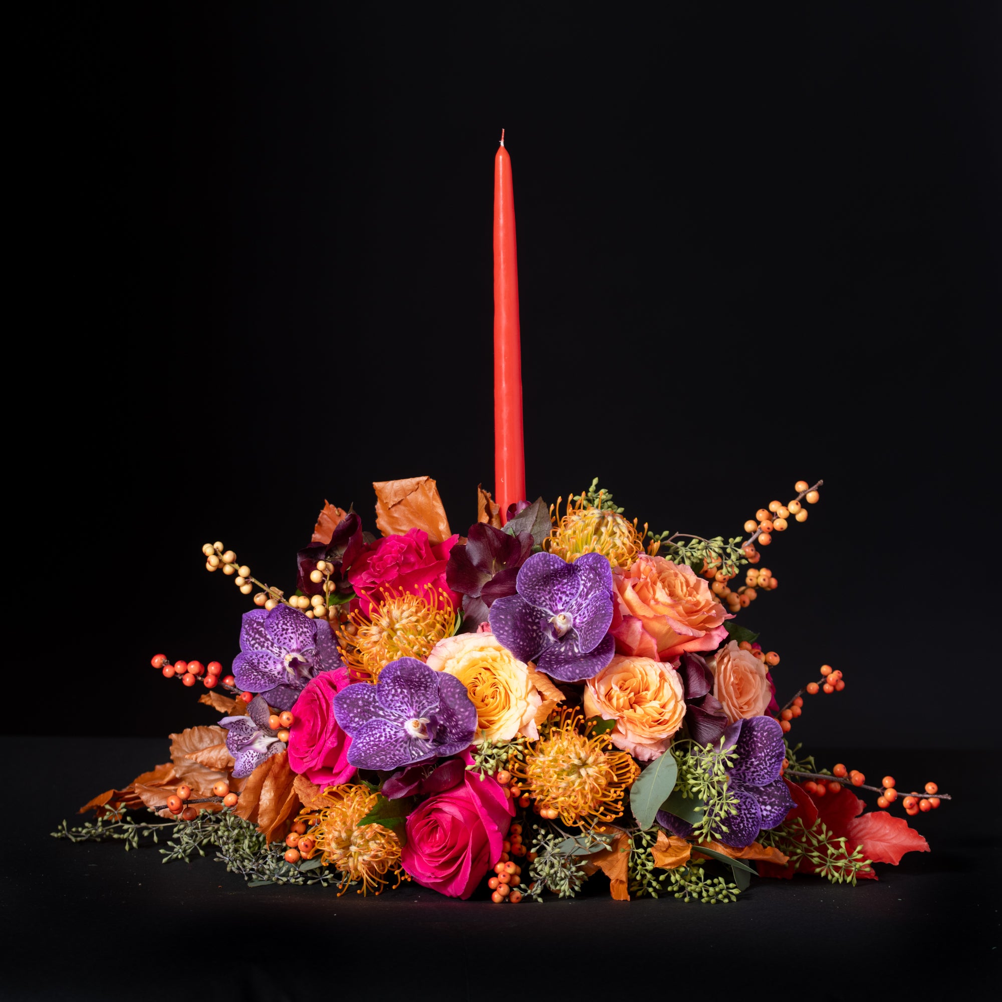 Approximately 10" x 12" in size, this lush holiday centerpiece features our novelty Vanda Orchids. Full of fall textures and vibrant colors, this centerpiece is sure to make a statement.