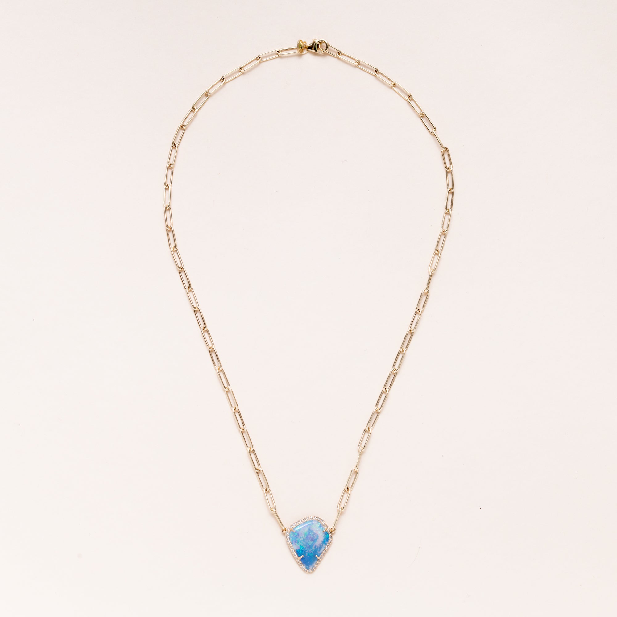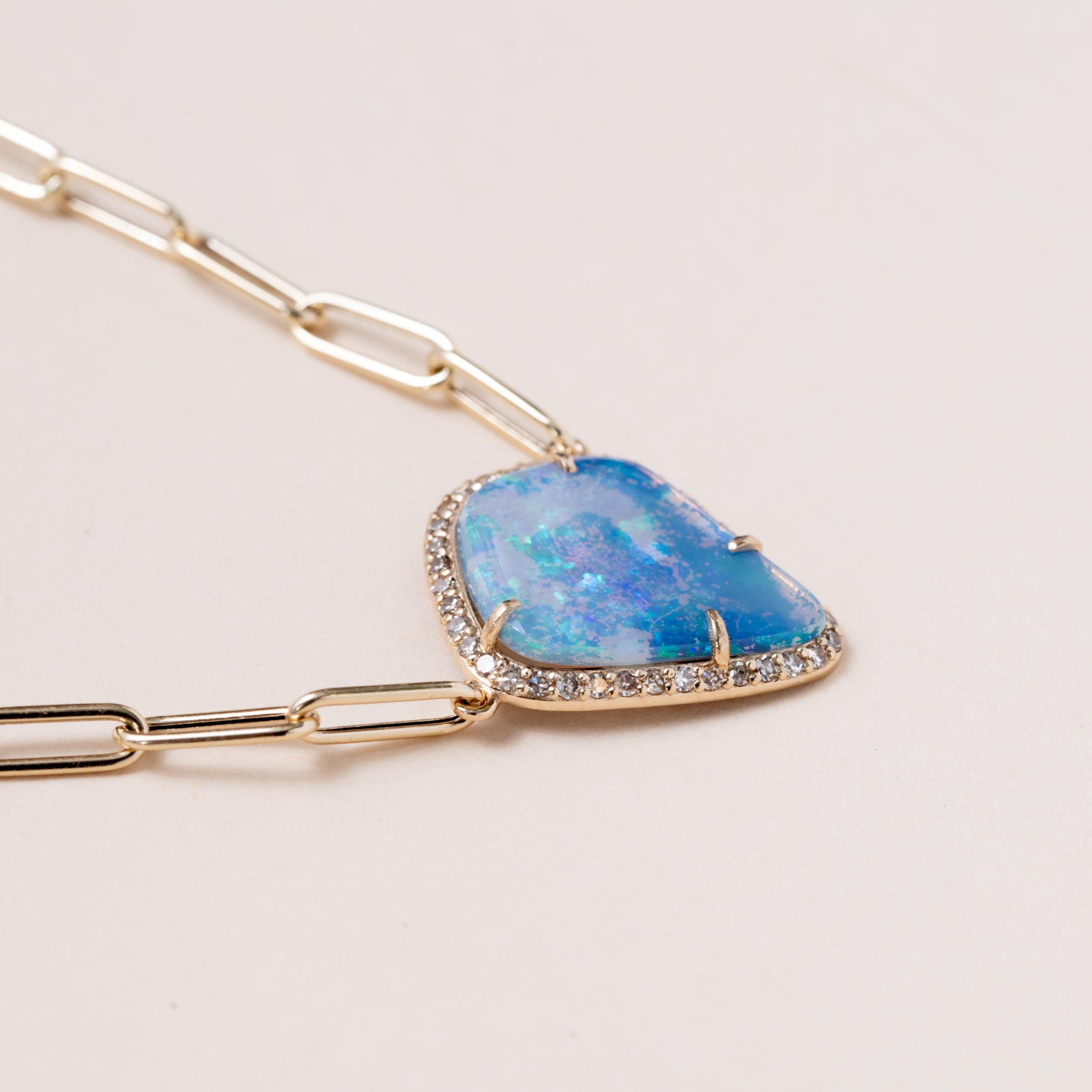 Australian Opal, Pave Diamonds and 14 K Gold Paper Clip Necklace