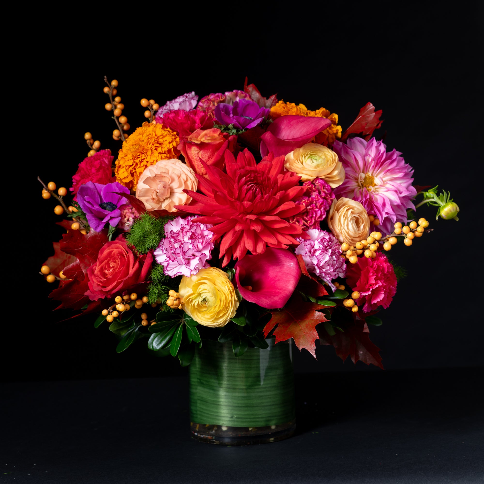 This bright and festive arrangement is only here for a very limited time. This design is centered around our novelty extra large Dahlias which are only here for few weeks so order yours while you can!