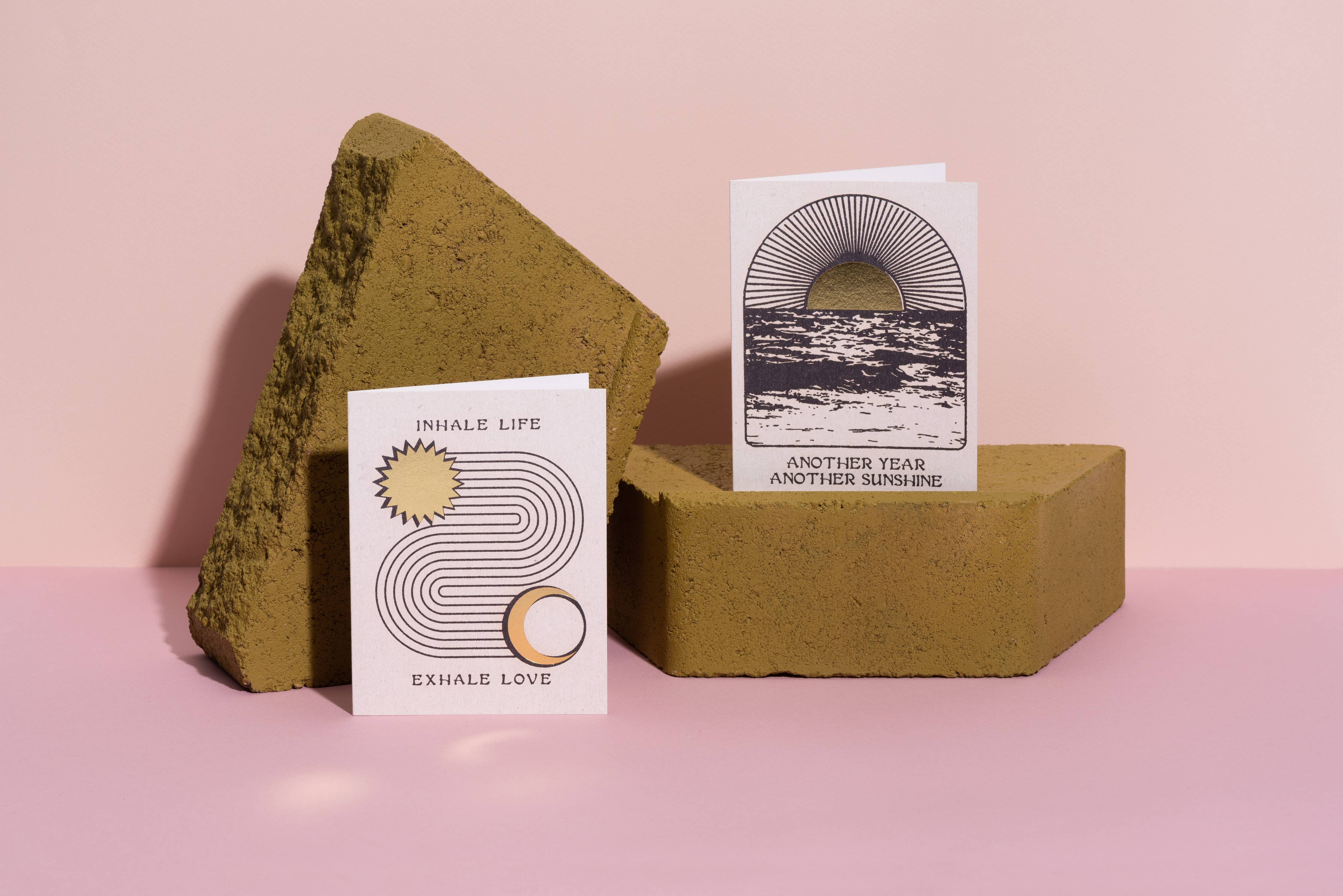 Blank inside. 100lb heavyweight card stock. Offset printed. 4.25 x 5.5 inches. Illustrated by Daren Thomas Magee. Printed by Red Cap Cards in Los Angeles, California, USA, on recycled paper.
