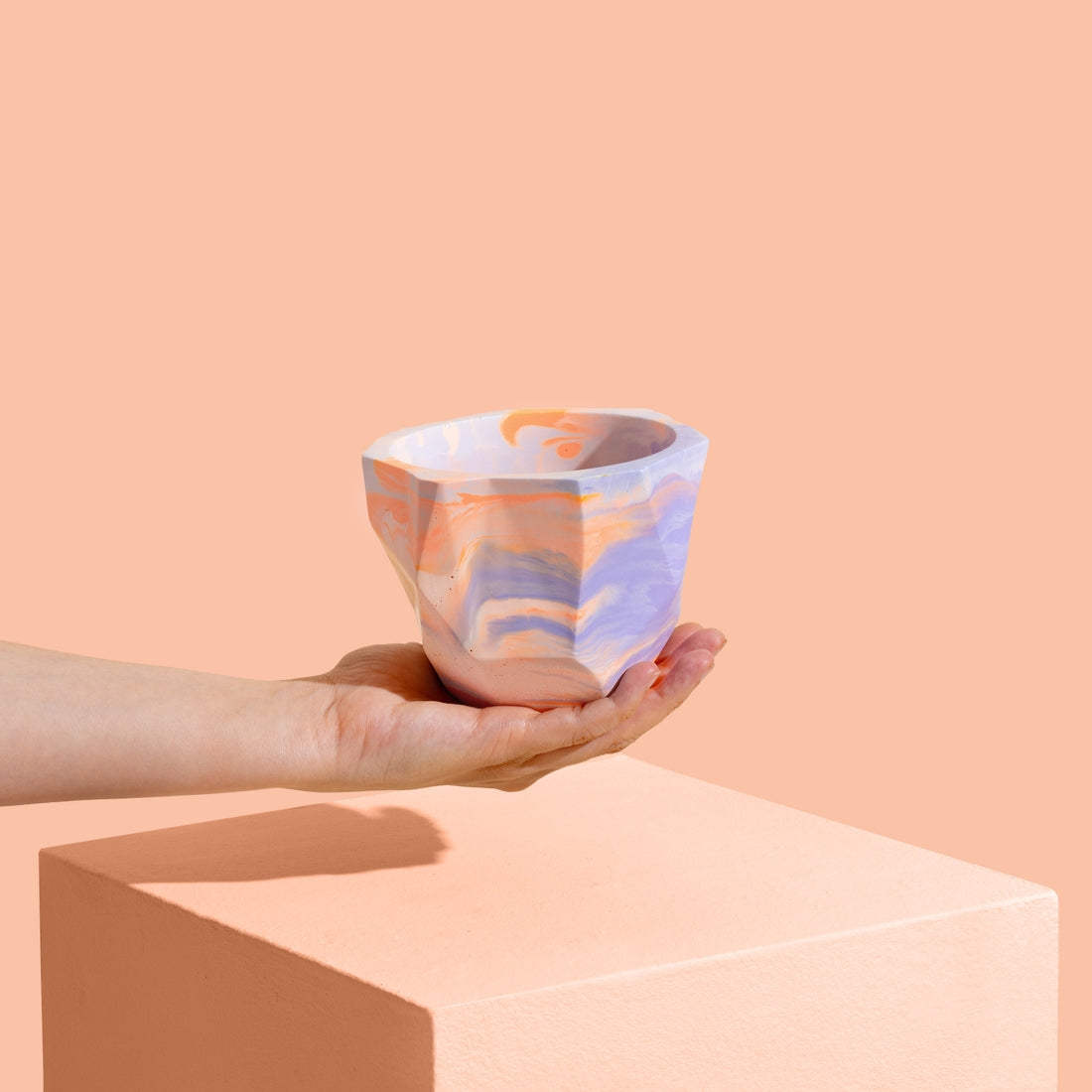 Marbled In Purple, Pale Peach, Lilac & Bright Peachy Coral tones, this Medium Jesmonite Plant Pot is ideal for upto 11cm dia plants, that don't need a lot of water, it can also be a very useful fruit bowl too. Give your home an injection of vibrant colours! each one is hand poured to give a detailed marbled pattern, this is due to the organic nature of the making process.