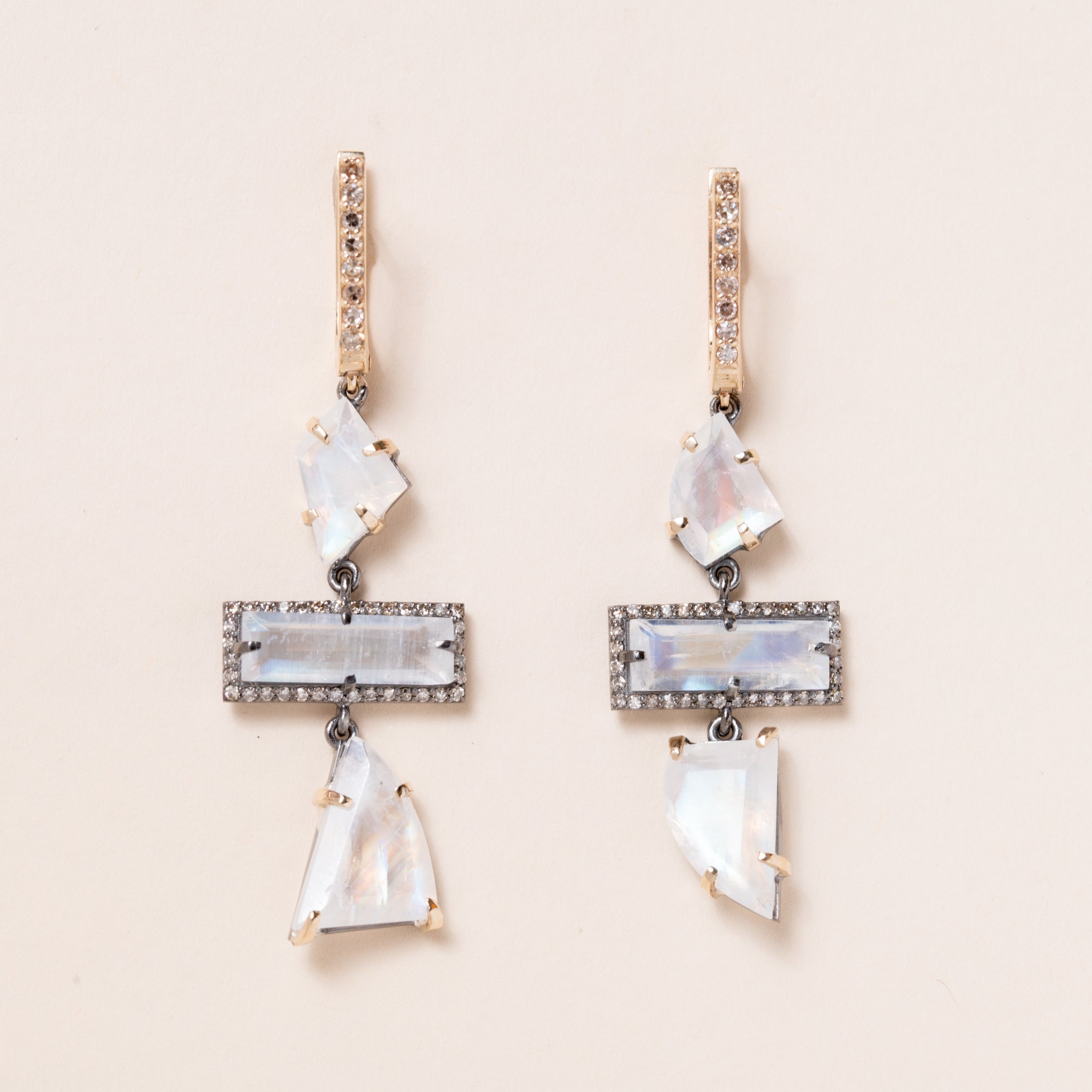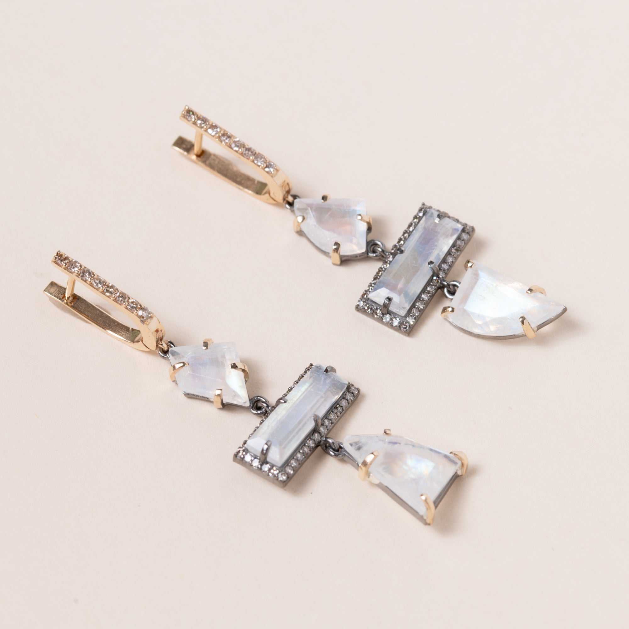 Moonstone, Pave Diamonds, Silver & 14K Gold Earrings