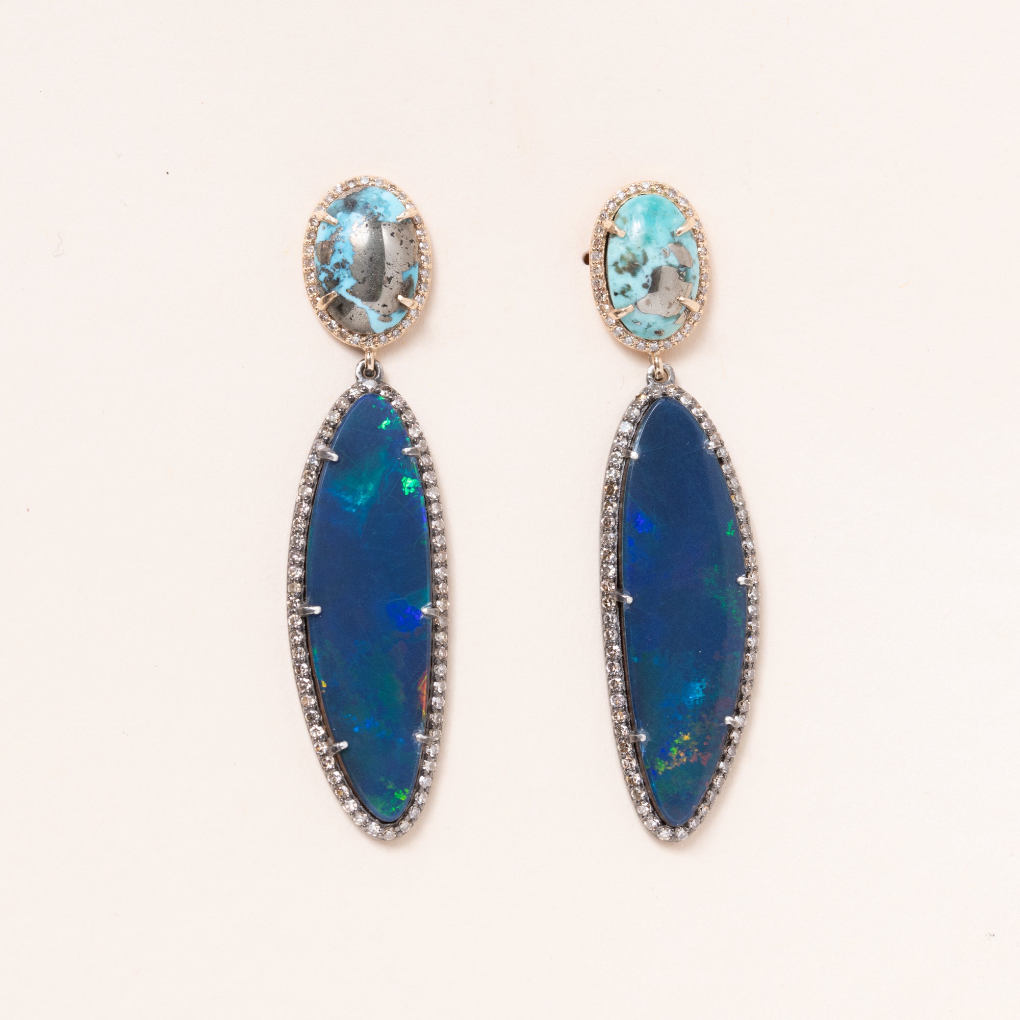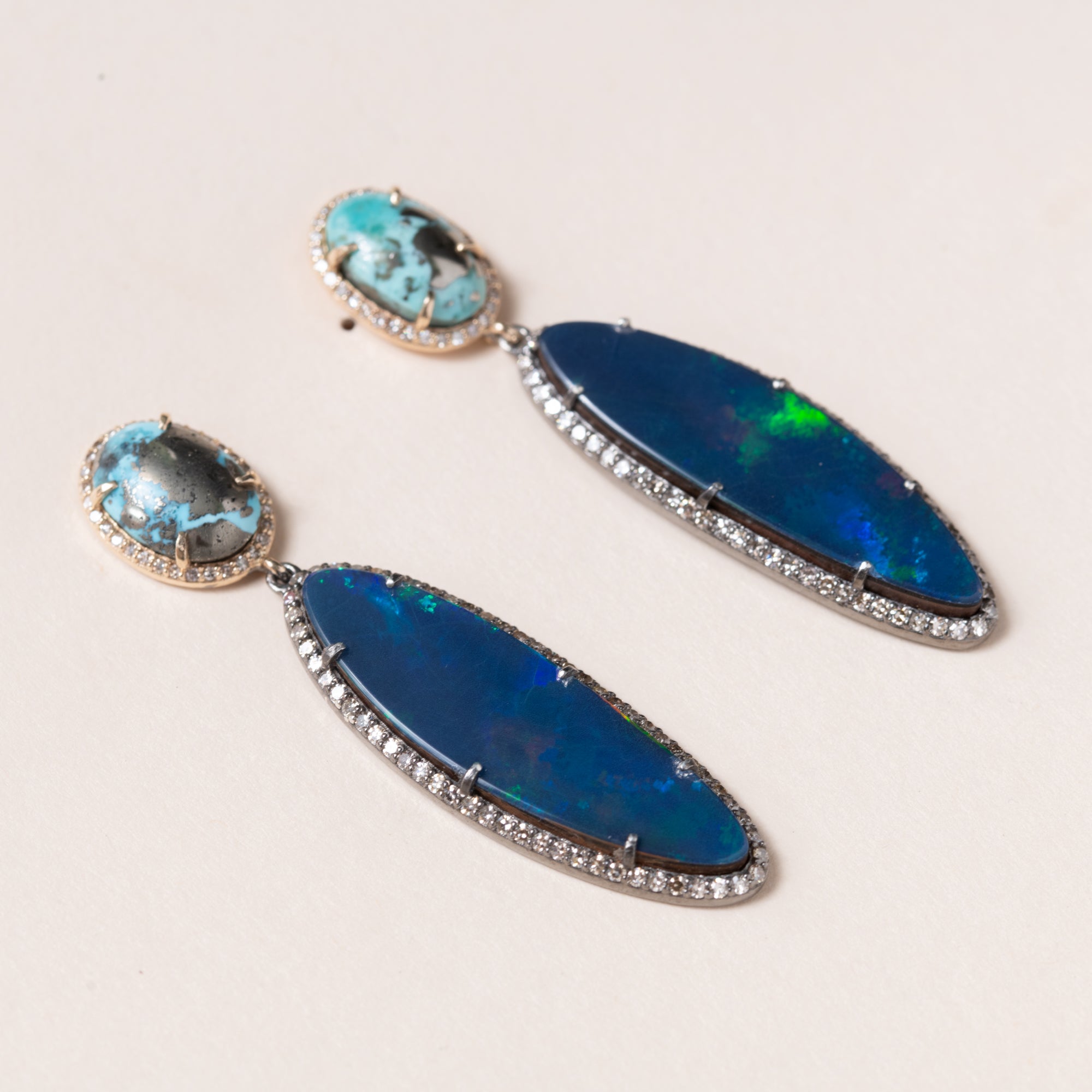 Persian Turquoise set in 14K Gold with Pave Diamonds, Large Australian Opals set in Silver with Pave Diamonds Earrings