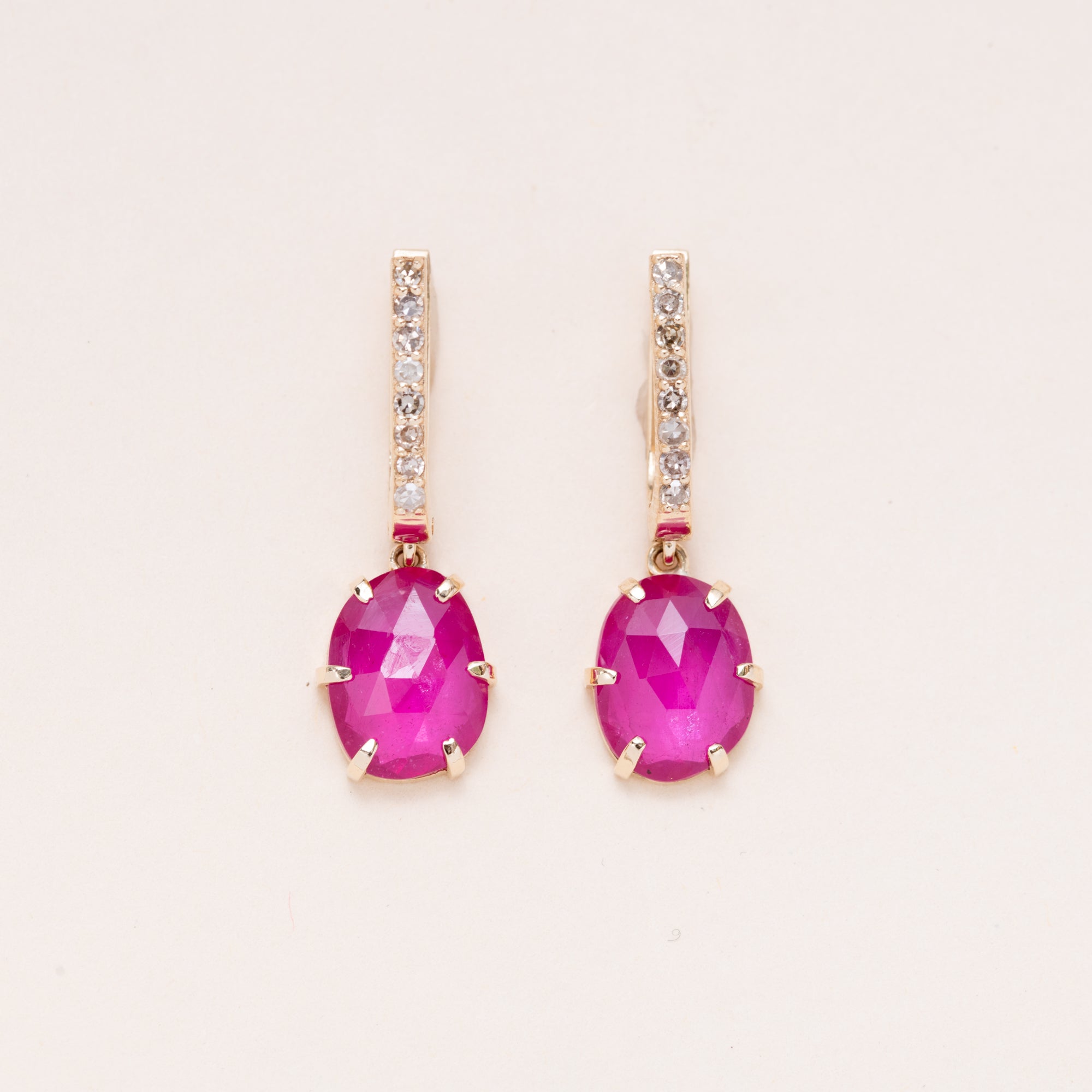 Pink Ruby Slices with Pave Diamond Leverback 14K Gold Earrings