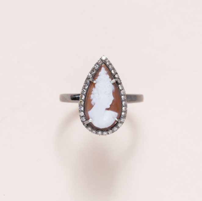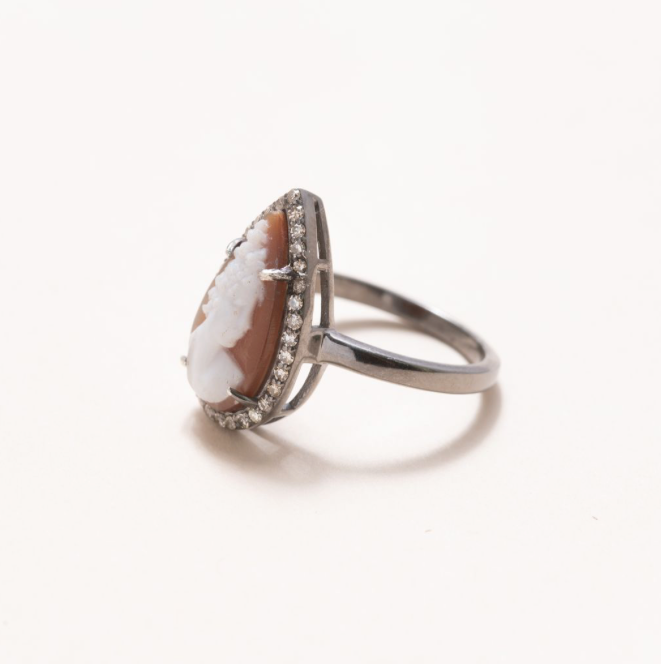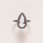 Tear drop Italian Shell Cameo, Silver & Pave Diamond Ring